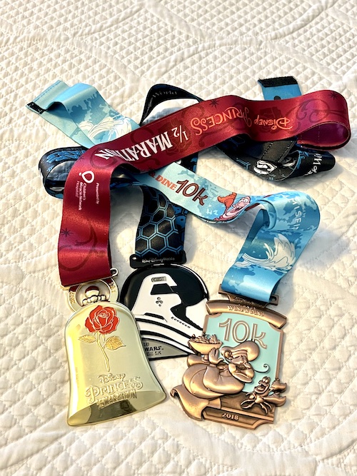 People who participate in runDisney races are very proud of their accomplishment and proudly wear the medals around all weekend (and maybe even once they get home!). If you happen to be around someone who has participated in one of the multi race challenges you will hear them coming before you see them because their medals will be clanking together as they walk. These medals are high quality bling! Metal medallions with silky neck ribbons make them a great memento of your time running around the parks.