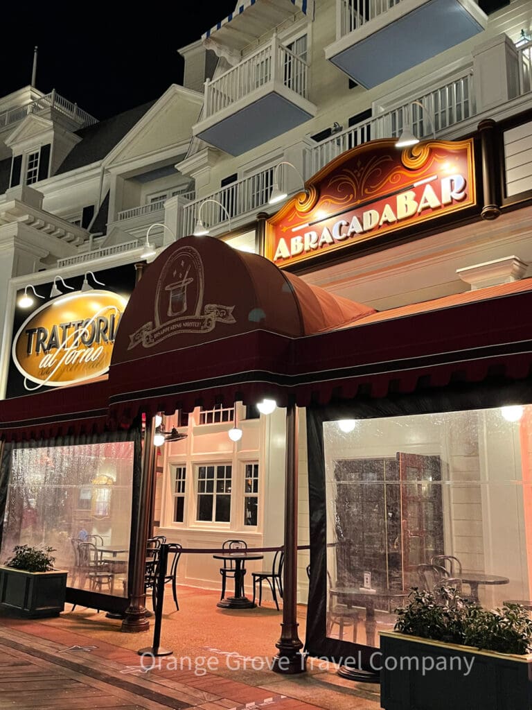 Trattoria al Forno offers outdoor seating, providing a scenic dining experience along the Disney's Boardwalk Inn.