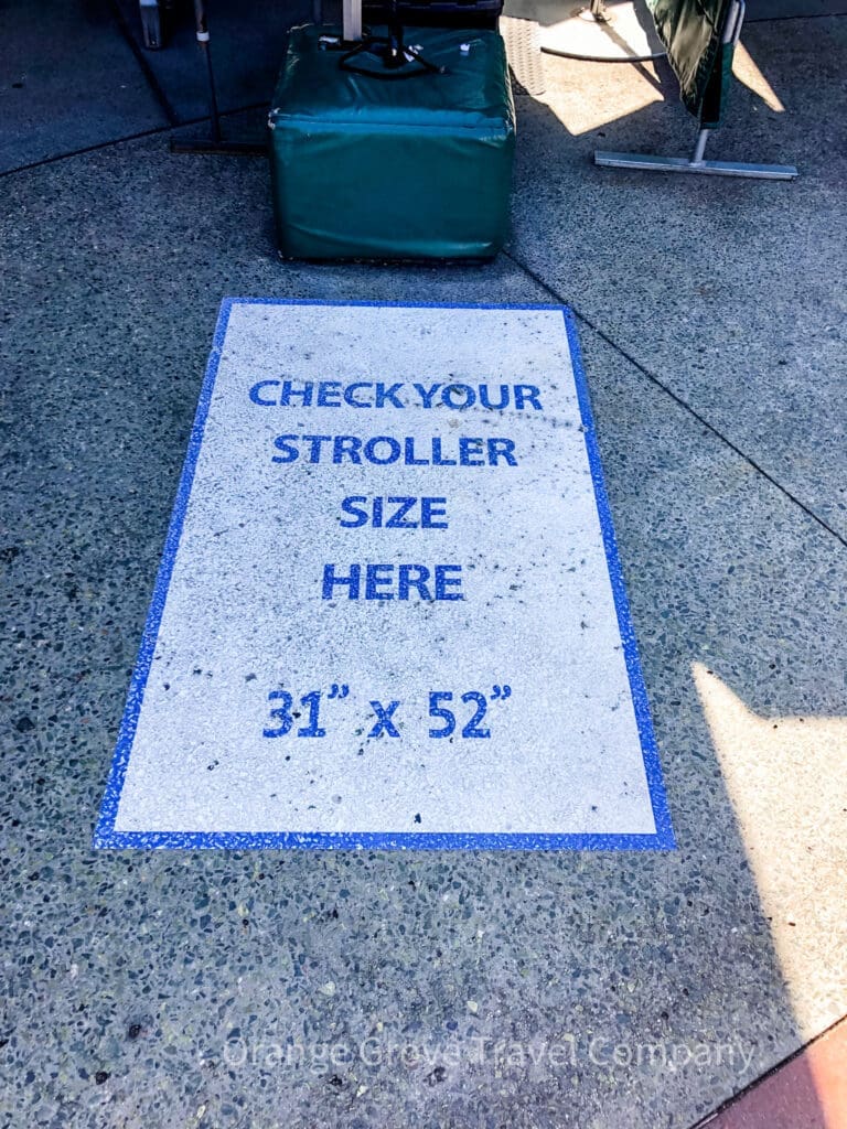 Be aware that there are a few rules Disney has regarding strollers. If you opt to bring a stroller from home, be sure to check out the size dimensions in the photo below to be sure that your stroller meets the requirements. ALL parts of the stroller must fit in the box. Everything from wheels to handlebars. Note: All Kingdom Stroller rentals meet the size requirements set by Disney.